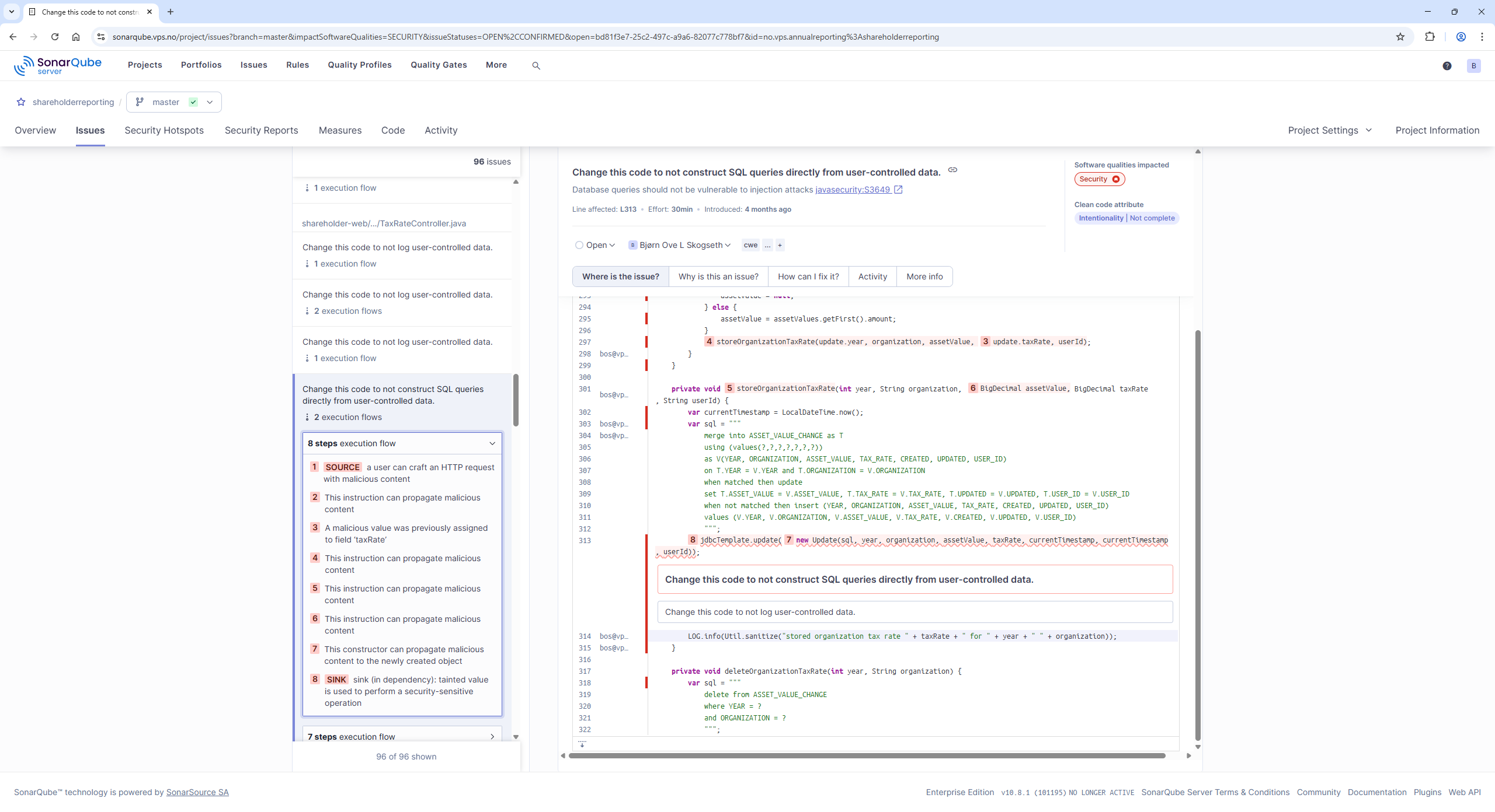 I am getting the message “Change this code to not construct SQL queries directly from user-controlled data” from SonarQube even though prepared statements with parameterization are used.