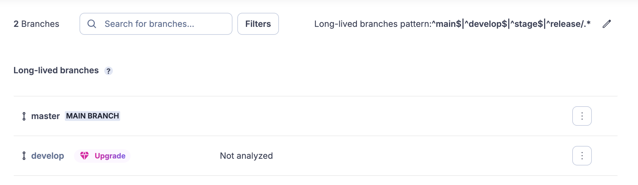 Branch detection in SonarCloud is configured with the regex: ^main$|^develop$|^stage$|^release/.* (long-lived branches)