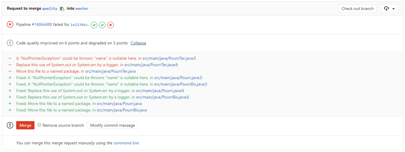 In the merge request I’d like to get a good summary of what’s the quality of changes going to enter. Did the test coverage increase? How many new issues are added/resolved? etc…