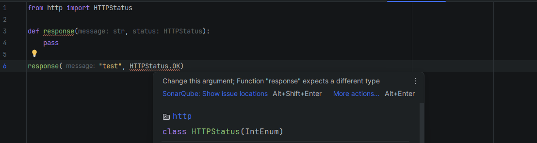 Ensuring that the rule Python:S5655 is enabled, I create a new file with the original code in VS Code and change the type HTTPStatus to a str in __response. This (correctly) causes an error to appear.