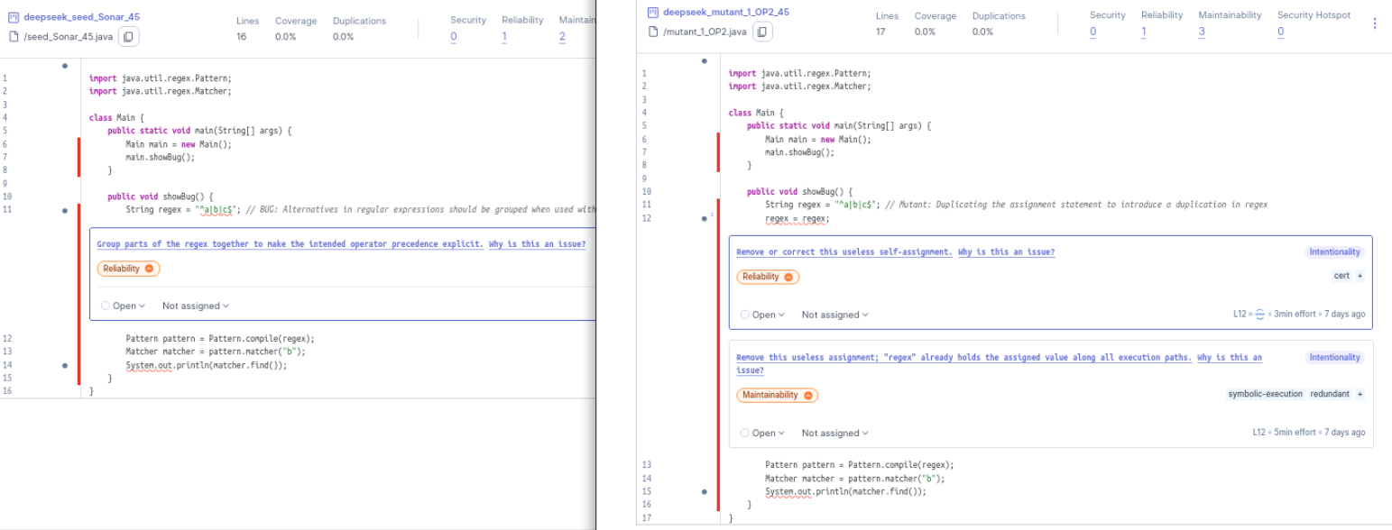 The expected SonarQube bug (RSPEC-5850) appears not to be detected in the code below, even though it’s caught in a very similar code as seen in the screenshot. Any thoughts?