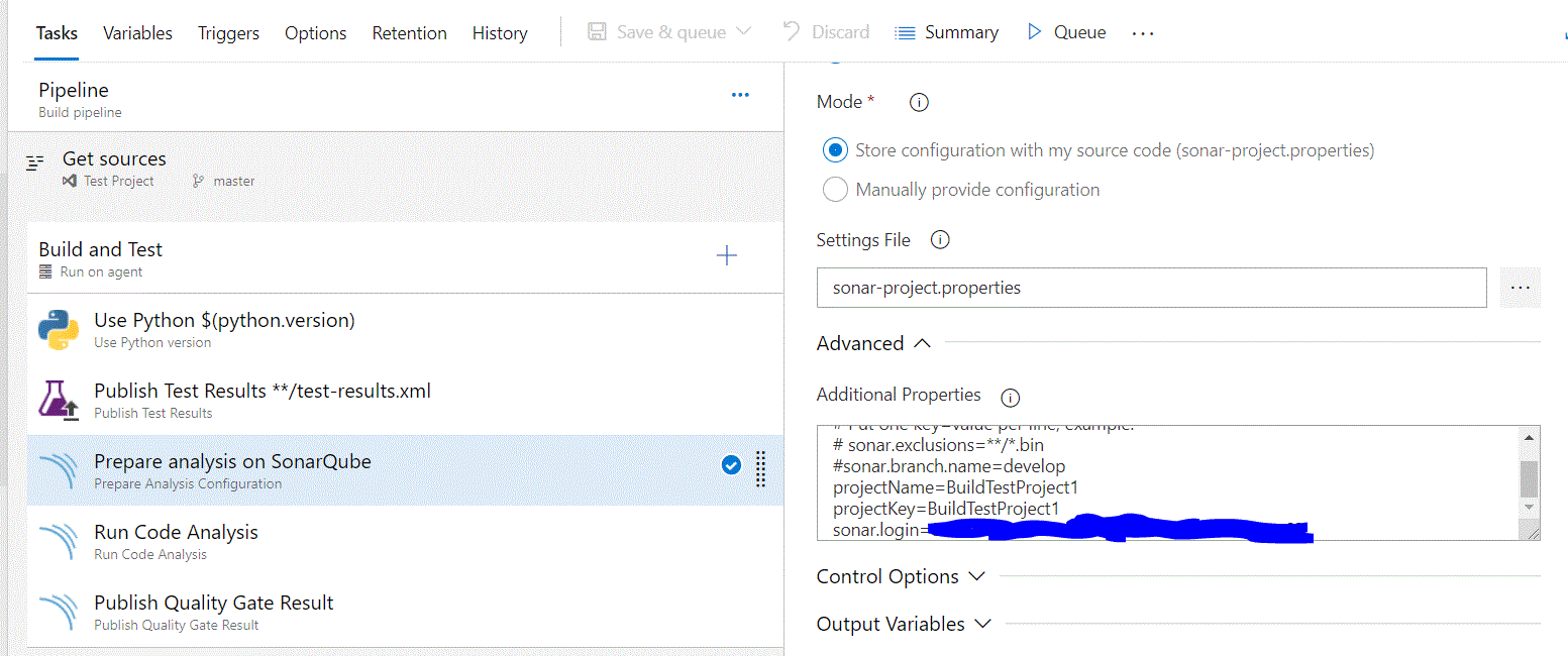 In the pipeline configuration you simply need to select your SonarQube endpoint (that you named BuildTestProject1 which is not a very good name, it should be called SonarQube or something like that).